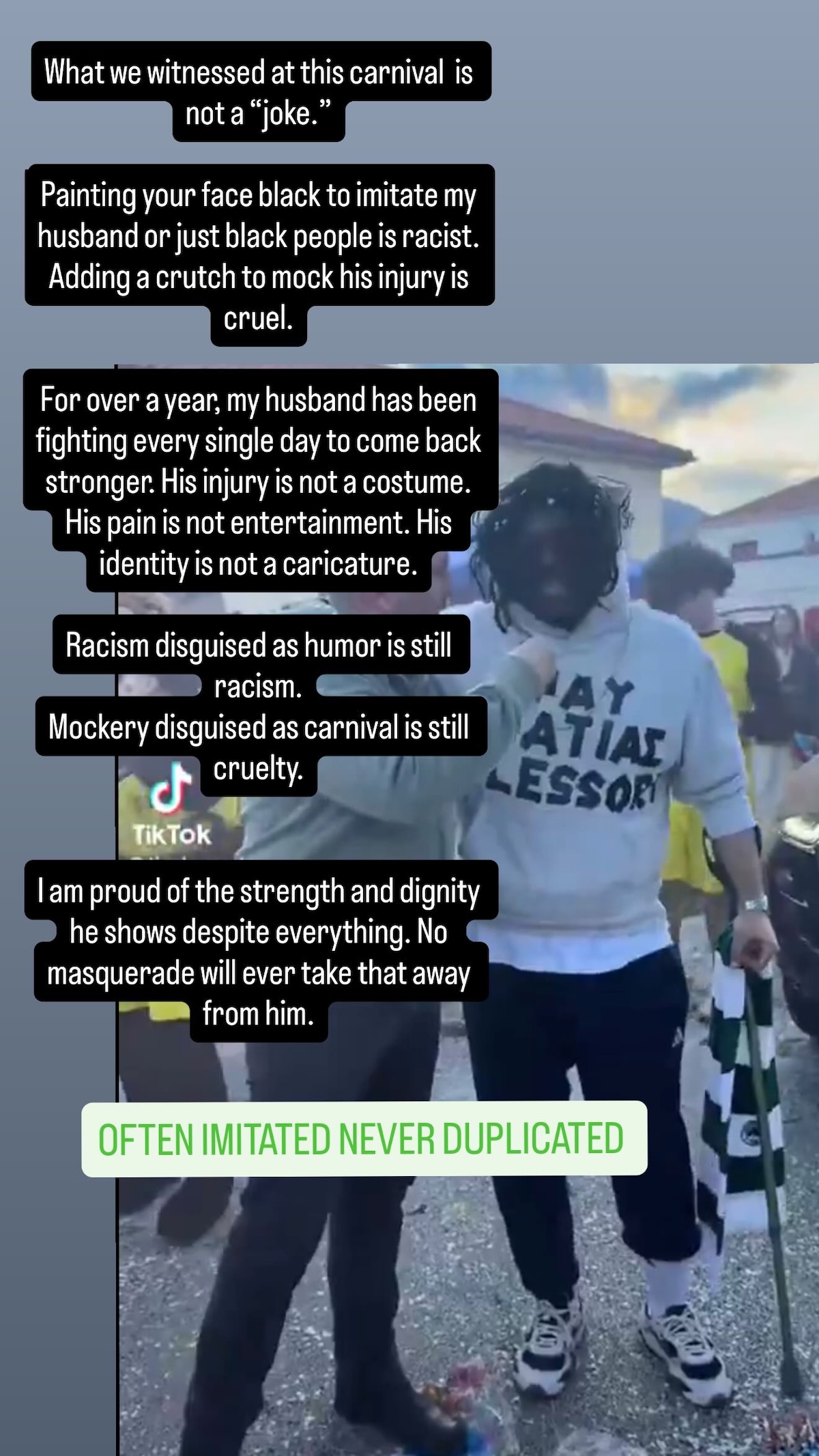 «Αυτό που είδαμε σε αυτό το καρναβάλι δεν είναι αστείο», έγραψε η Τρέισι Λεσόρ, θέτοντας αμέσως τα πράγματα σε σωστή προοπτική. Στη συνέχεια, ανέλυσε κάθε στοιχείο της αμφίεσης με ακρίβεια: «Το να βάφεις το πρόσωπό σου μαύρο για να παριστάνεις τον σύζυγό μου ή τους μαύρους ανθρώπους, είναι ρατσισμός». Με αυτή τη δήλωση, η σύζυγος του αθλητή απέρριψε κάθε προσπάθεια να χαρακτηριστεί το περιστατικό ως αθώο ή αθώο χιούμορ.