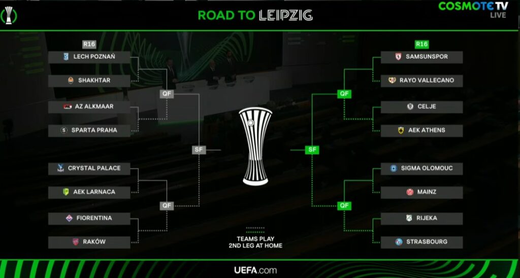 Η ΑΕΚ, από την πλευρά της, θα έχει την ευκαιρία να πάρει άτυπη ρεβάνς για την ήττα της στην πρεμιέρα της League Phase, όταν αντιμετώπισε την Τσέλιε και ηττήθηκε 3-1 στη Σλοβενία στις 2 Οκτωβρίου. Ο πρώτος αγώνας της φάσης των «16» θα διεξαχθεί πάλι στη Σλοβενία στις 12 Μαρτίου, με τη ρεβάνς να είναι προγραμματισμένη για τις 19 Μαρτίου στη Νέα Φιλαδέλφεια. Εάν η Ένωση περάσει στα προημιτελικά, θα αντιμετωπίσει τον νικητή του ζευγαριού ανάμεσα στη Σαμσουνσπόρ και τη Ράγιο Βαγεκάνο.